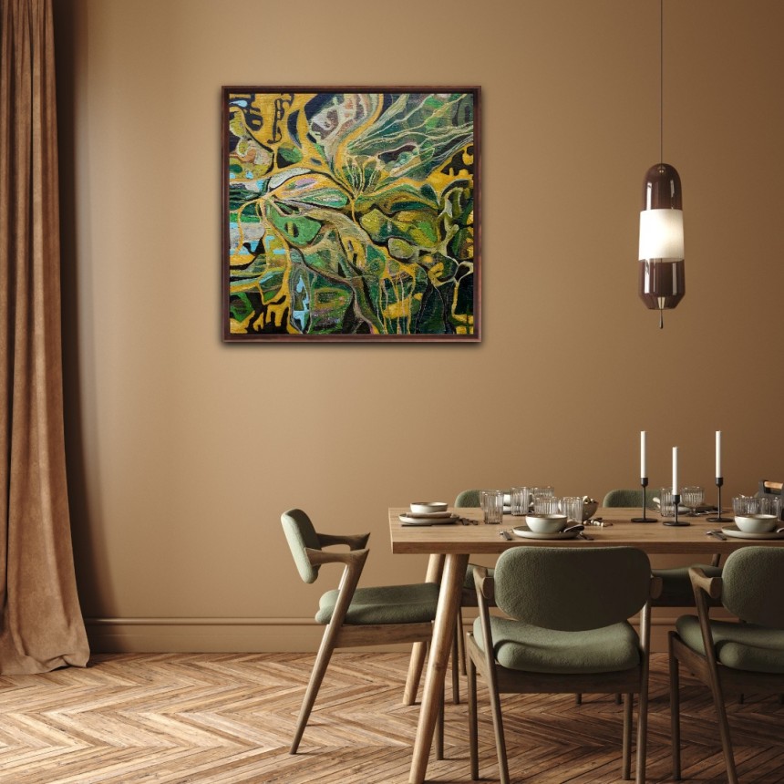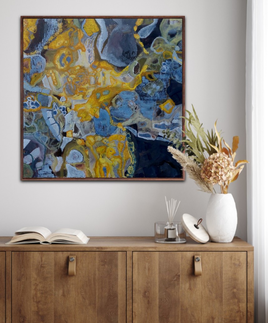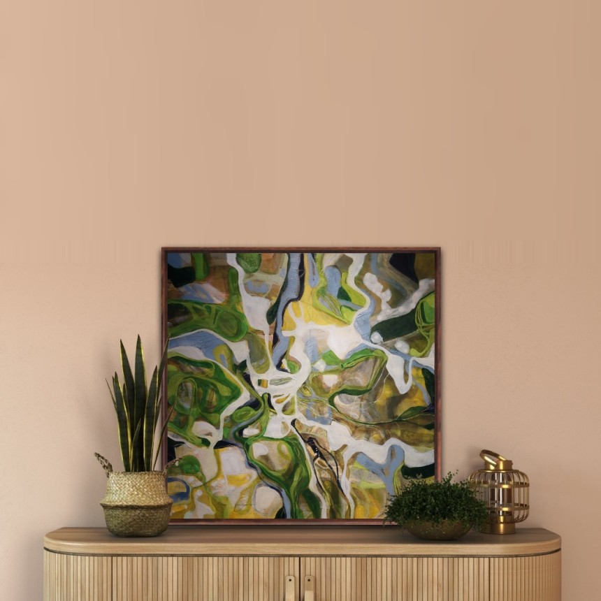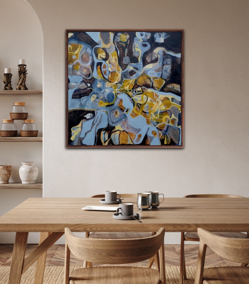 Oil/acrylic on canvas, 100x100cm. Framed in pine with bistro varnish.