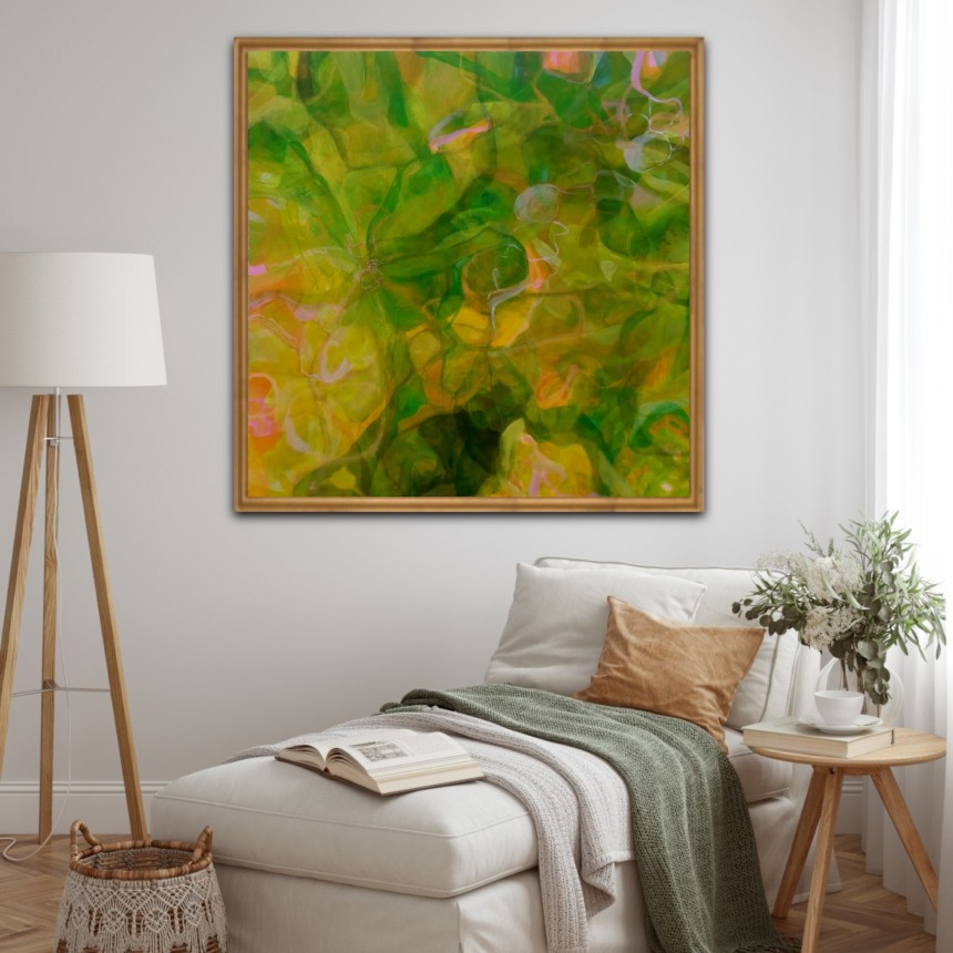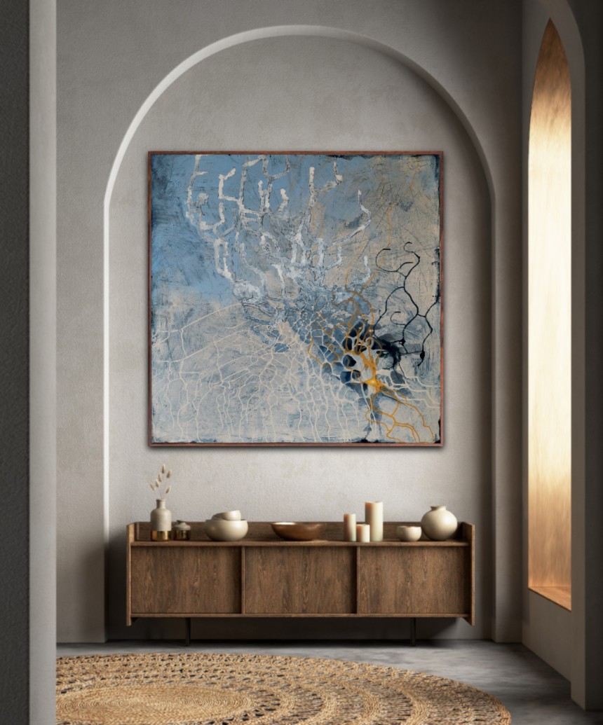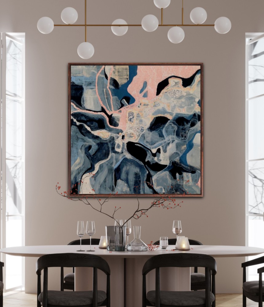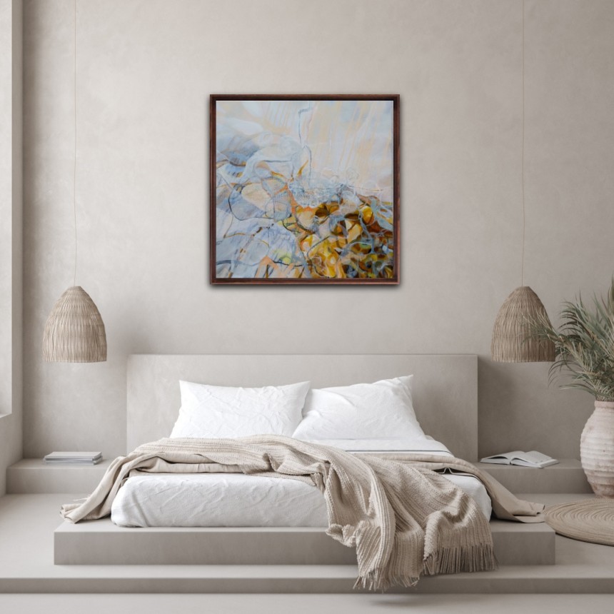 Oil/acrylic on canvas, 100x100cm. Framed in pine with bistro varnish.